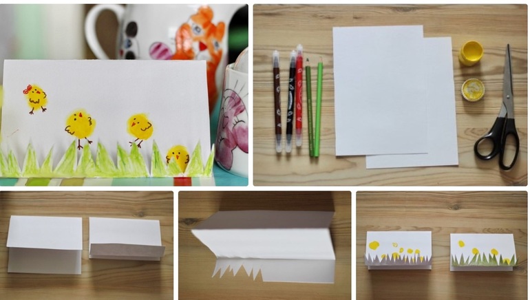 Делюсь/рекомендую/советуюПАСХАЛЬНАЯ ОТКРЫТКА СВОИМИ РУКАМИ. При небольшой помощи взрослого сделать такую весеннюю открытку на Пасху сможет даже ребенок 3-4 лет. Лист бумаги формата А4 сгибаем пополам так, чтобы внизу остался край сантиметра четыре, который затем перегибаем в противоположную сторону. Ножницами на нем вырезаем "траву". Разукрашиваем ее. Пальчиками оставляем отпечатки желтой краской и, после ее высыхания, пририсовываем фломастерами клювики, лапки, глазки и крылышки.