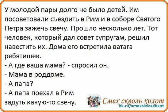 Есть еще и в стихах)):Молодожёны все в печали- Живут два года, детей нет. Чем им помочь врачи не знали, Но кто-то дал один совет: Поехать в Рим, поставить свечку, Святого Павла есть собор. Рецепт сомнительный, конечно, Но не подвёл он до сих пор. Прошли года. Как-то советчик Решил ту пару навестить, Узнать, не помогла ли свечка, И как дела у них спросить. Пришёл, стучится. Дверь открыла Девчушка где-то лет семи: --Простите, я братишек мыла, Их сёстры всех испачкали. --А где родители-то, лапа? --Мама рожать пошла к врачу, Поехал в Рим, в собор, мой папа — задуть какую-то свечу.