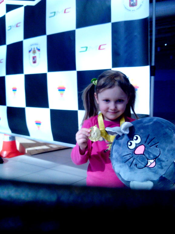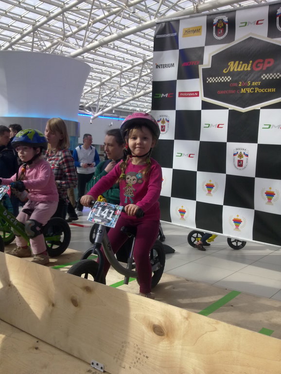 Маруся очень старалась на отборочных заездах, оба раза пришла первая. Потом пошли гулять, пиццу есть и чуть не пропустили финал! И совершенно удивленные встали на пьедестал с цифрой один! Маруся от неожиданности растерялась бедняга, засмущалась вся! (Да и я тоже, че уж скрывать:-) Ещё и в лотерее главный приз вытянули,
