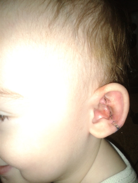 Хотя сложно сказать ,что виновата именно она. Ребенок ,с 8-ми месяцев(еще не умея ходить) подружился с лесенкой.Каждый день ползал вверх и вниз. Родители и старшие дети расслабились и....вуаля!!! Слетел с 4-ой ступеньки. В полете что-то поймал( не можем понять что). Нижняя часть уха была рассечена на две части...