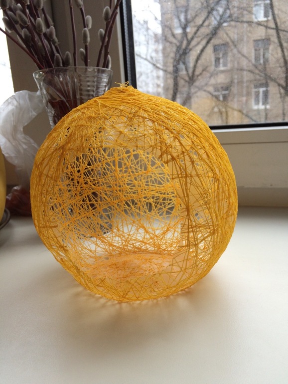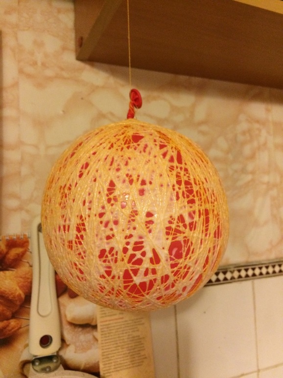 Воздушный шарик обмазываем клеем ПВА, потом намотать нитку, я потом сверху еще намазала ПВА.