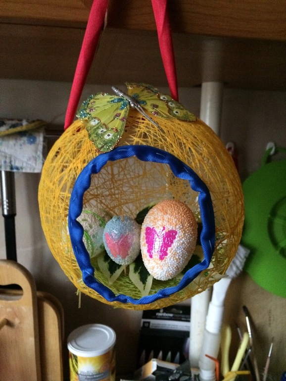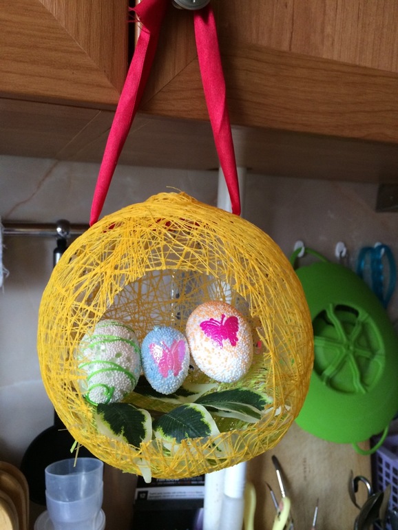 А дальше уже как фантазия пойдет. Кто-то цыплят сажает, у меня их не было, я яичко зубочисткой скрепила и отодрала от домашнего искусственного дерева немного листиков. И пришила ленточку.