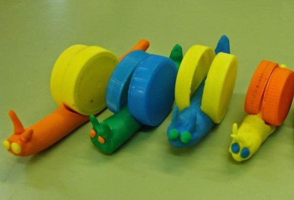 Очень простая поделка для самых маленьких. Тело улитки делается из пластилина или игрового теста, к которому просто с двух сторон прикрепляются крышки - улиткин домик.