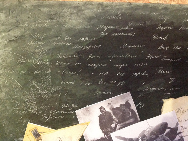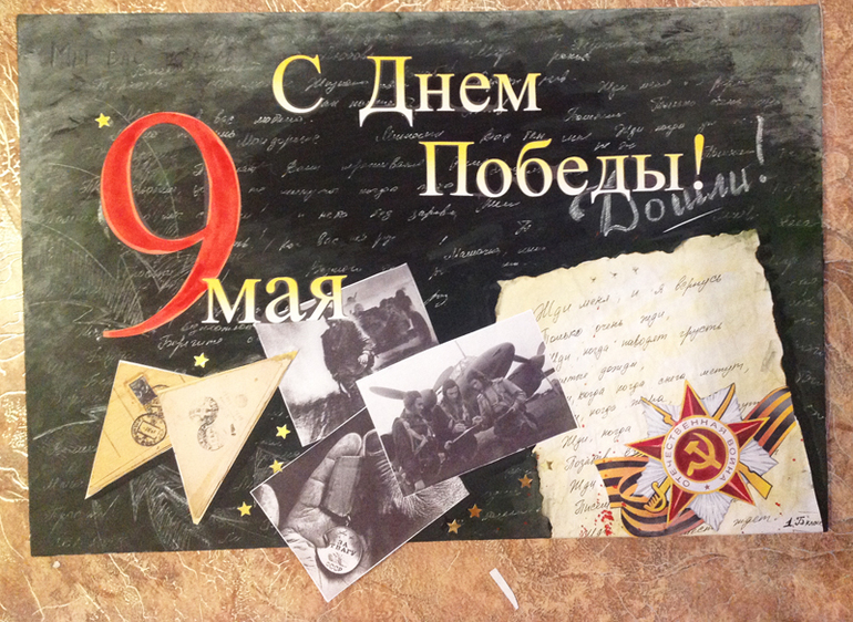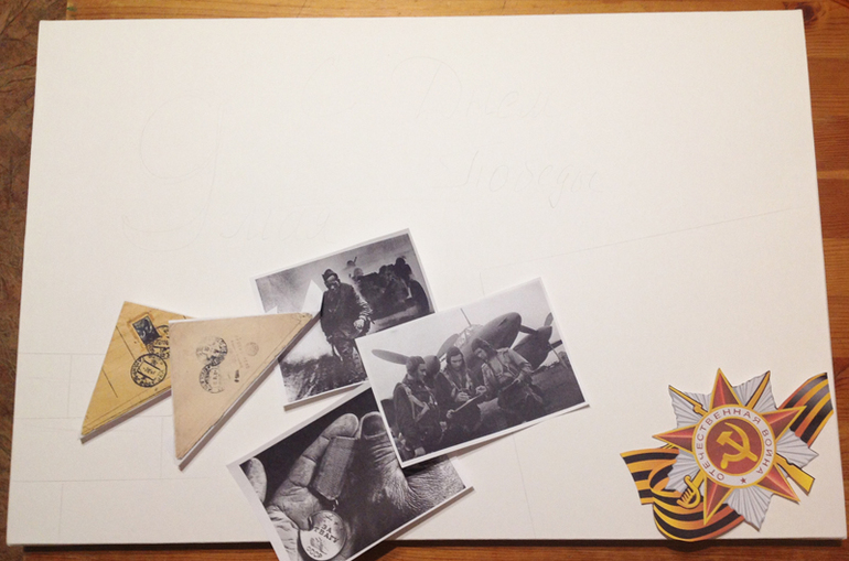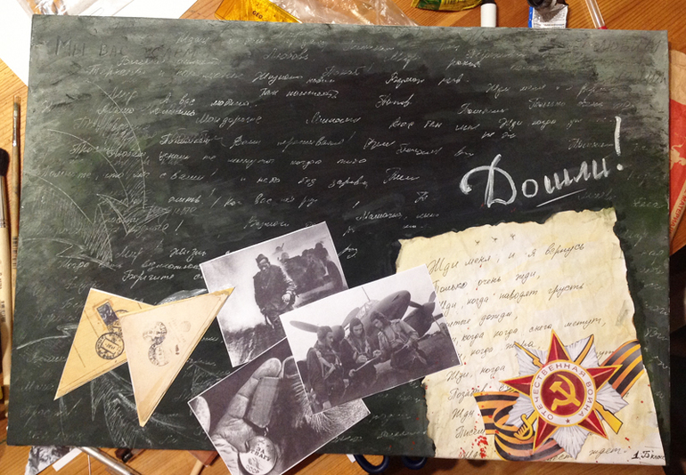 Спасибо! Нижний слой гуаш, когда она высохла, то сверху белой гелевой ручкой написала строчками просто вольные выражения, которые могли бы встречаться в письмах тех времен: "Сынок, мы тебя ждем!" "Мои дорогие...."Конверты — нашла фото в электронном варианте. Распечатала их в формате А5. Потом не обрезала, а загнула края для объема. Отсюда и штампы)В письме: помяла бумагу, покрасила акварелью. Дала высохнуть и от руки стихотворение "Жди меня, и я вернусь..." А еще края чуть пожгла и есть несколько капель крови, запачканные края)Фотографии, так же нашла в инете и просто распечатала)