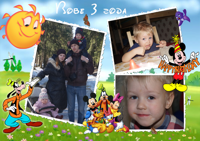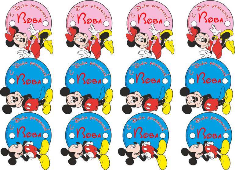 Для начала меня не обошло стороной "день рождение в стиле...". Начала я готовиться за 2 месяца, но делала все в последнюю ночь...до 6 утра фотошопила эти плакатики, причем в час ночи я начала, в 2 ночи поняла что не фига не получается,уже и комп закрыла,потом думаю неееет, раз хотела надо сделать)) получилось 6 плакатов из которых 3 надо вырезать...и я как супер молодец перепутала формат,думала а3 и а2 соответсвенно будут в два раза больше...получились мини плакатики...и микки вместо - во всю стену, получился обычным плакатом)) плюс папа подпортил картину,вечером перед др по моему плану он должен был купить гелевые шарики с микки и мини, но папе было лень,сказал если увидим - купим завтра, если Вова попросит...так что ночью перед др мы вешали плакаты, вырезали флажки и надували обычные шарики,оставшиеся еще с др Милы, и вешали их как гирлянду...кстати Мила проснулась и увидев шарики уже не засыпала пока мы вешали)а Вова дрых)