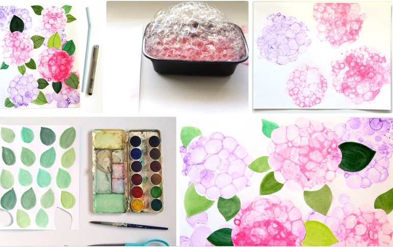 НЕТРАДИЦИОННЫЕ ТЕХНИКИ РИСОВАНИЯ. РИСУЕМ МЫЛЬНЫМИ ПУЗЫРЯМИ. Сегодня мы вам расскажем и покажем, как можно нарисовать очаровательные цветы гортензии при помощи цветных мыльных пузырей. Все очень просто: смешайте вместе 1 часть краски (мы использовали акриловые), 1 часть средства для мытья посуды и 2 части воды. При помощи пластиковой трубочки сделайте побольше мыльных пузырей. Прислоните к пузырям бумагу, чтобы на ней получился отпечаток. Листочки дорисуйте отдельно. Черной гелиевой ручкой нарисуйте на листьях прожилки.