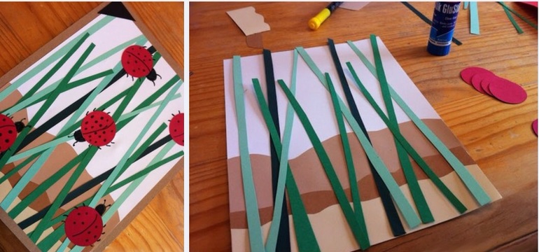 ВЕСЕННЯЯ АППЛИКАЦИЯ. Эту весеннюю аппликацию из цветной бумаги без труда сможет сделать ребенок дошкольного возраста. Для этого ему надо сначала нарезать бумагу зеленого цвета (разных оттенков) на длинные полоски. Это будет трава. Далее нужно вырезать кружочки из красной бумаги. Помогите малышу последовательно приклеить все части аппликации на картон. Лапки, усики и точечки ребенок дорисует божьим коровкам черным фломастером в конце работы.