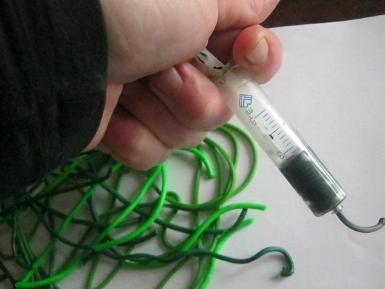 Теперь нам нужно сделать жгутики. Для этого разбираем шприц (вытаскиваем поршень из цилиндра). Из кусочка пластилина делаем "колбаску" и помещаем ее в цилиндр шприца, вставляем поршень на место и немного придавливаем пластилин. То же самое проделываем с пластилином другого цвета. Теперь шприцы с пластилином кладем (горизонтально) в емкость с горячей водой на 2-3 минуты (чтобы пластилин стал мягким). Затем берем шприцы из воды, надавливаем на поршень и выдавливаем жгутики.