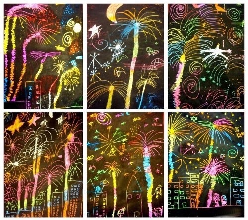 -Раскрасьте лист бумаги или картона разноцветными восковыми мелками. Не жалейте восковые мелки, они должны покрыть бумагу толстым слоем! Единственный цвет, который нельзя использовать - черный.