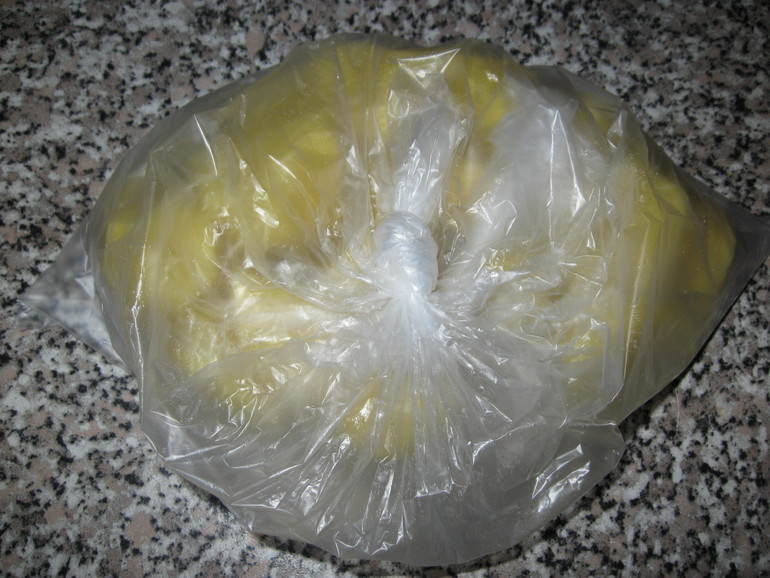 Чистим картошку, режем (крупную я разрезаю на 4 части), моем, складываем в обычный маленький пакетик, завязываем на узел и сверху протыкаем пакет, потом ещё один пакетик сверху и так же вверху дырочку.