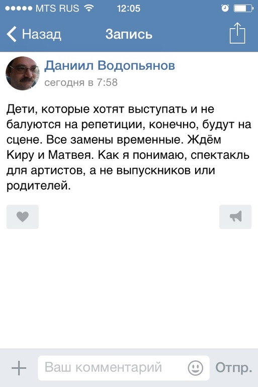 сказать,что я в ауте- ничего не сказть... нда...уж....вчера — он нам не нужен,сегодня- пусть идет,постоит... вчера- сценка для выпускников,сегодня- дети решили себя показать и на других посмотреть... Ваш учитель,наврное, болезнью Альцгеймера страдает? +Сюда еще весеннее обострение шизофрении(роли ДИВАНА-до такогоо еще додуматься надо было!) ... Огромный привет Матвею- ему надо медаль за участие и вам- медаль за выдержку. Я бы точно ему указала на ЕГО РОЛЬ в этом спектакле))))
