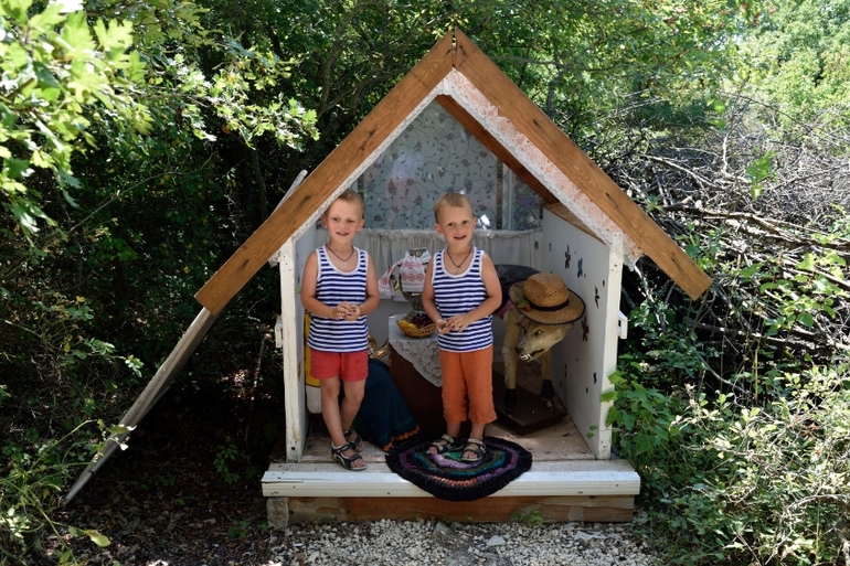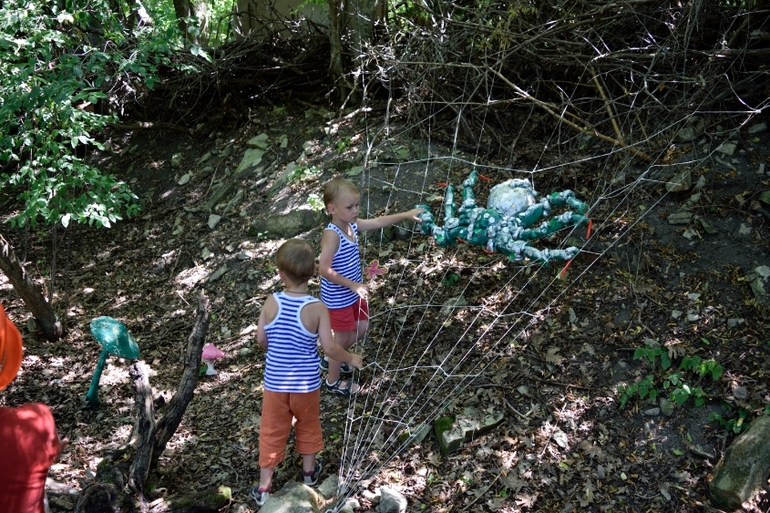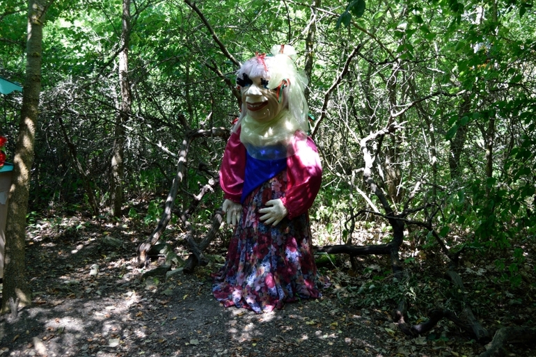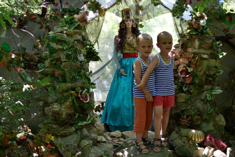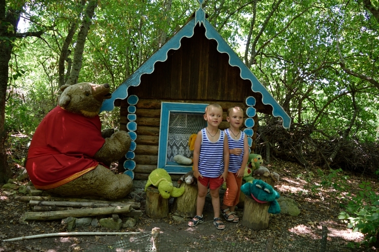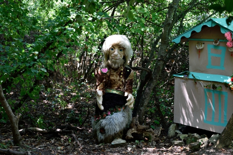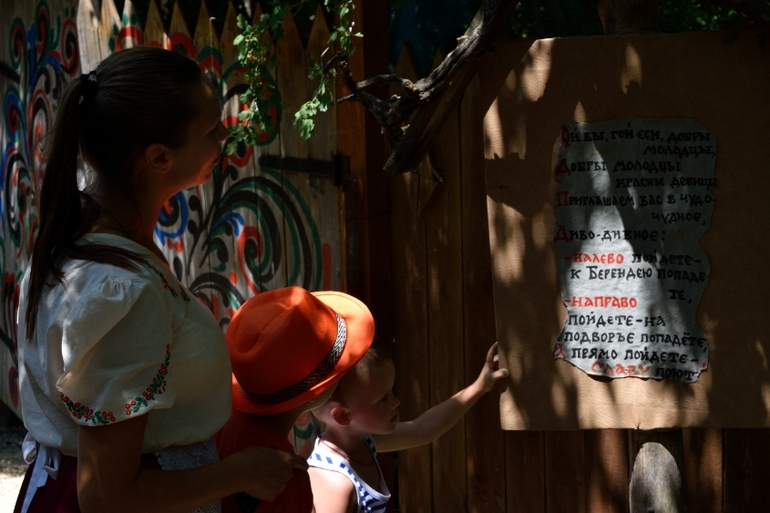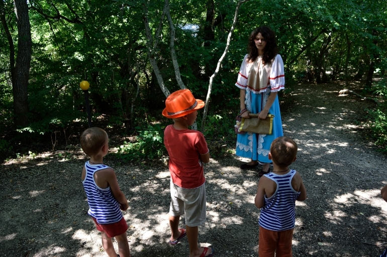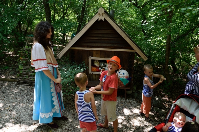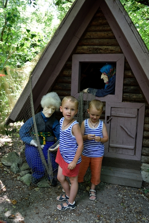 Затем для детей прогулка - сказка. Встречает нас у ворот девчушка-веселушка и ведет в царство берендея через сказочный лес. В лесу стоят разные сказочные сюжеты или герои, девочка загадывает загадки про сказки, за правильный ответ дает деревянные монетки - берендейчики. Кто больше наберет, тому приз (символический)) Декорации на уровне школьного кружка рукоделия, актерские данные подростков-организаторов весьма посредственны, но все настолько душевно, да еще в прохладе леса... мне ну прям очень-очень понравилось!