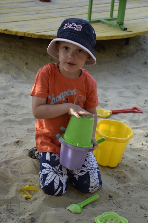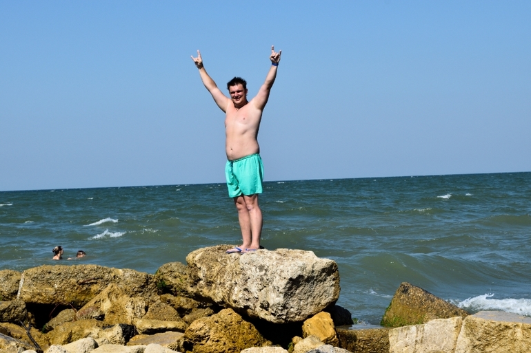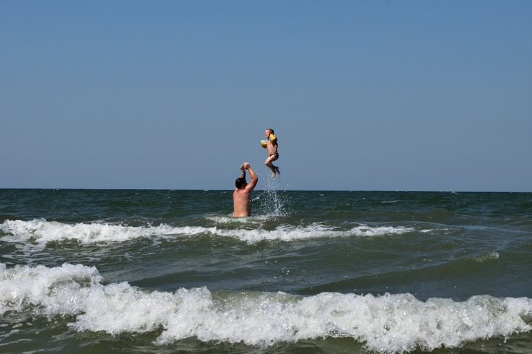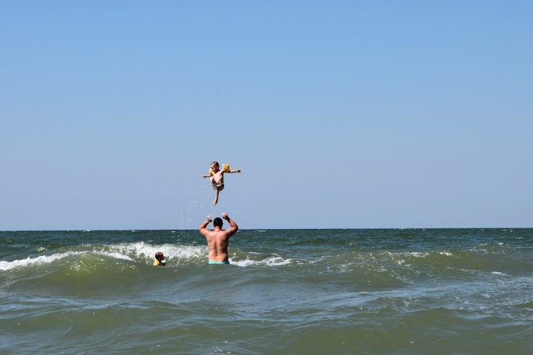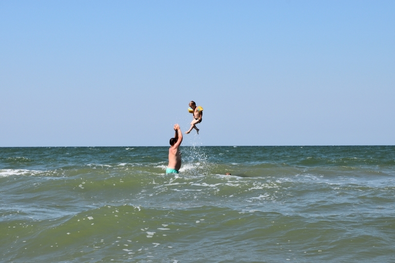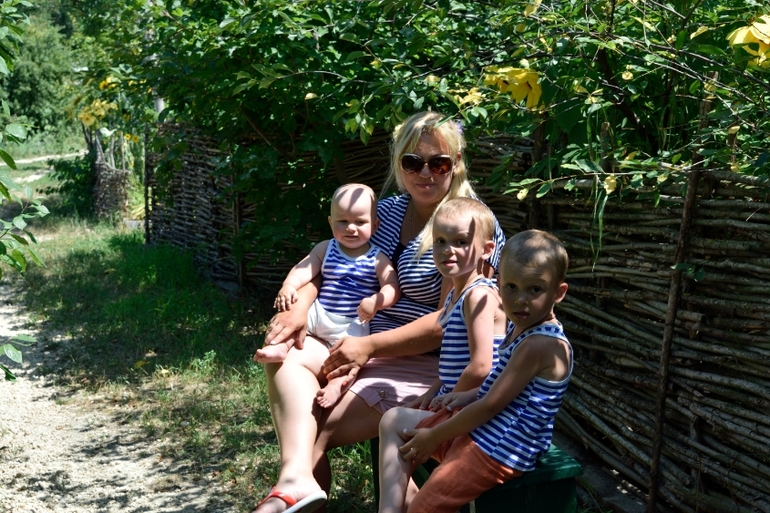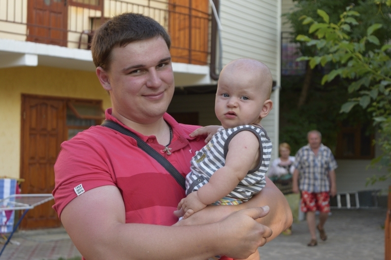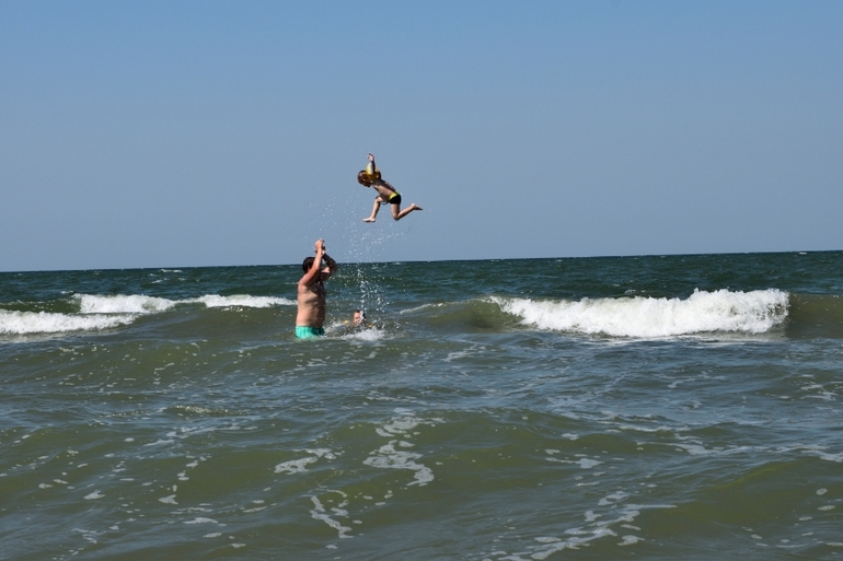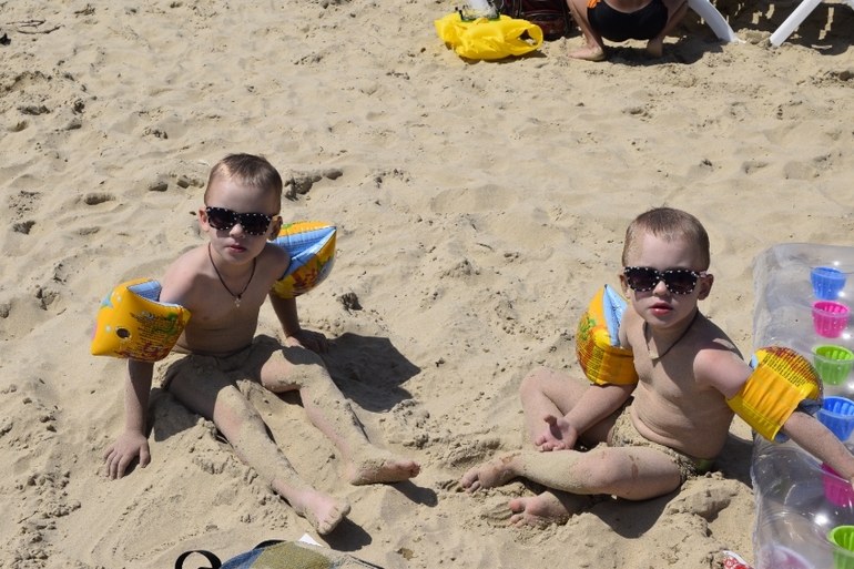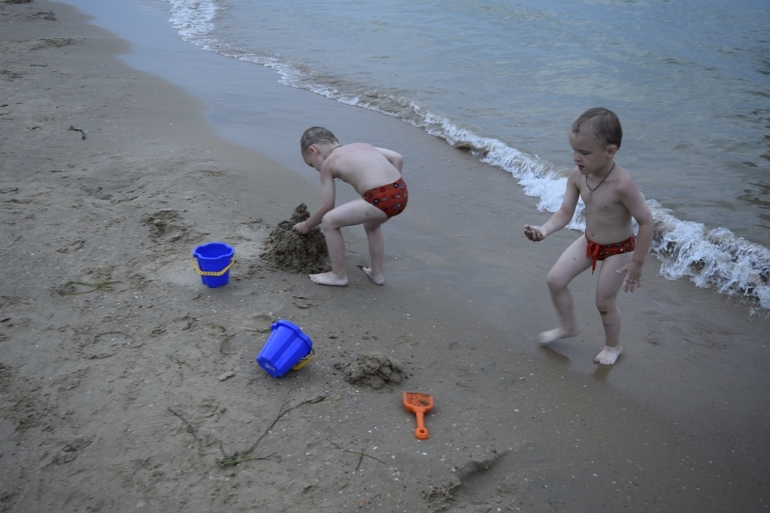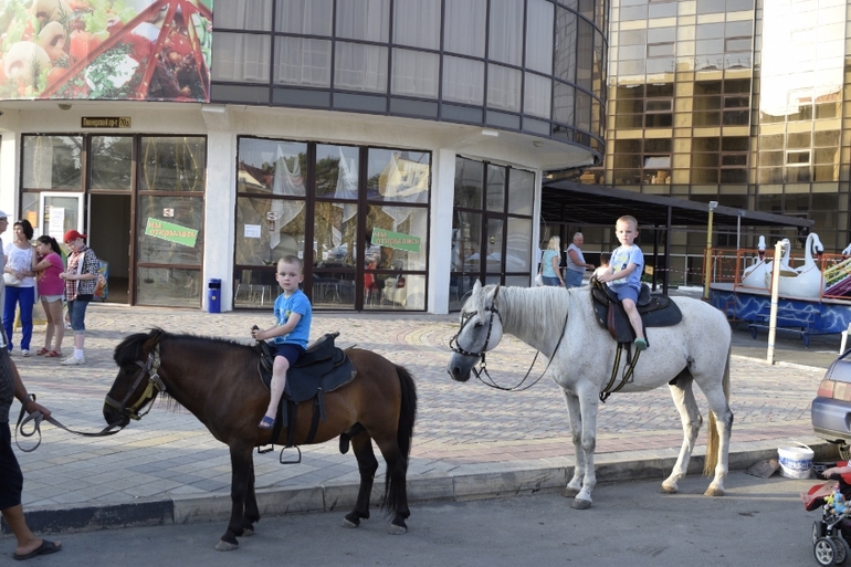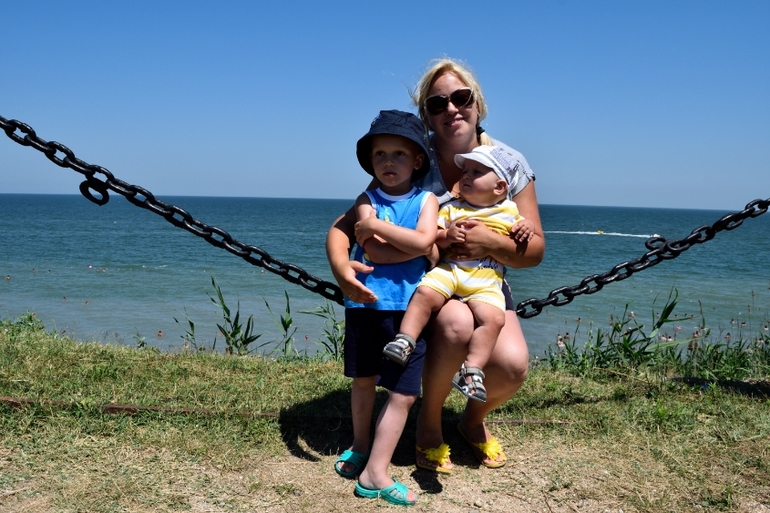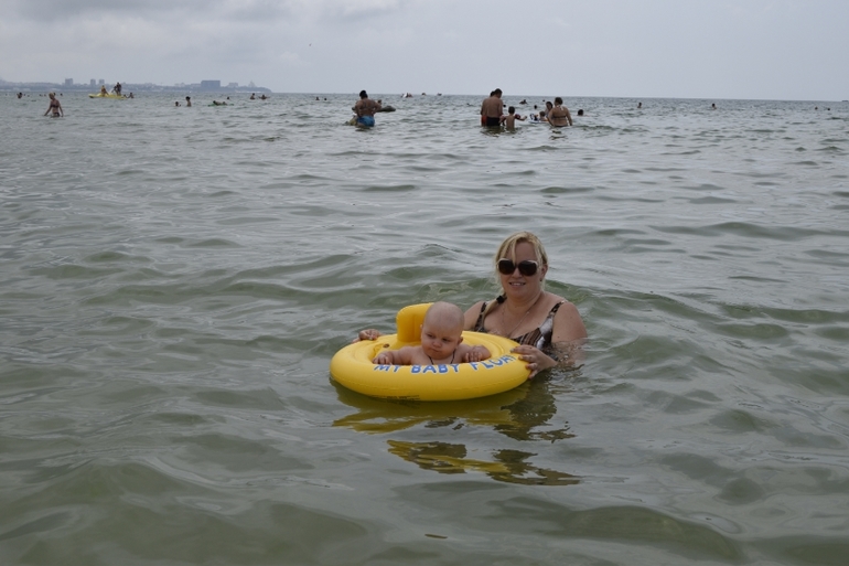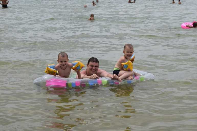 Ехали мы на машине. Выехали из дома в 12 дня, на место приехали в 5 утра. днем делали 3 привала, кушали, разминались, отдыхали. Ночь ехали без остановки. В пробках стояли немного, но пару раз поторчали. Дети вели себя весьма прилично, если учесть, что 16 часов они провели сидя в своих креслах. То спали, то ели, то пели ))) Назару было 9 месяцев, он почти всю дорогу спал. Приехали. По навигатору не нашли место, пришлось будить хозяев, чтоб рассказали, как к ним попасть. Встретили нас, размести ли сразу же. 2х этажный корпус, номер на 2м этаже. 2х спальная кровать, 2х спальный диван, холодильничек, телевизор, кондиционер (как бы мы без него там выжили не представляю) большой шкаф, совмещенный снузел (душ+туалет) в номере, все работает, чисто -все как и обещали. Правда манеж, привезенный с собой, Назару поставить оказалось некуда, поэтому он спал со мной, а папа с близнецами ))) Ну разместились мы, попадали спать. Отдохнули, пошли за завтраком. Бесплатный завтрак включает в себя пол порции молочной каши (через день рисовая/овсяная (правда мне казалось, что она перловая)/манная) и чай (майский). Идем на пляж. Путь на пляж выглядел так: проезжая часть улицы, где ездят не совсем вменяемые местные жители (в первый день один м***день чуть не наехал на моего ребенка и еще и обозвал его щенком, причем ребенок шел со мной за руку, я просто в последний момент успела его выдернуть испод колес) по бокам от проезжей части - тротуары, сплошь заставленные, как и полагается, остро "необходимой" нам продукцией. Идти практически не где. Идти до моря не 300 и не 400 метров... все 500. Нам-то ладно, а вот парням по жаре было тяжко. Пляж... песок... мягкий, теплый и очень грязный... серый.... Пляж узехонький, люди лежат буквально друг у друга на головах, очень много зон домов отдыха и лагерей, откуда постоянно просят переместиться, а куда? Море за все время нашего там пребывания почти все время штормило, пару дней весьма прилично. А на второй или третий день и вовсе "зацвело" и все время мы плавали в водорослях (то еще удовольствие) На третий день моих мужиков скосила так называемая аборигенами "аклиматизация" Думаю, все дело в плохо промытой посуде. В ход пошли фильтрум, цирукал, регидрон и прочие "боеприпасы".
