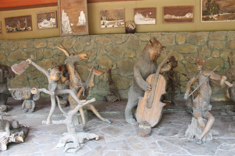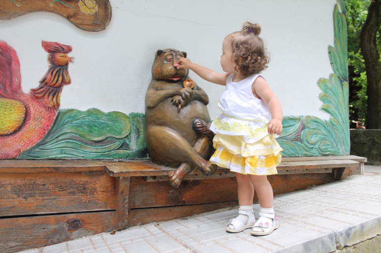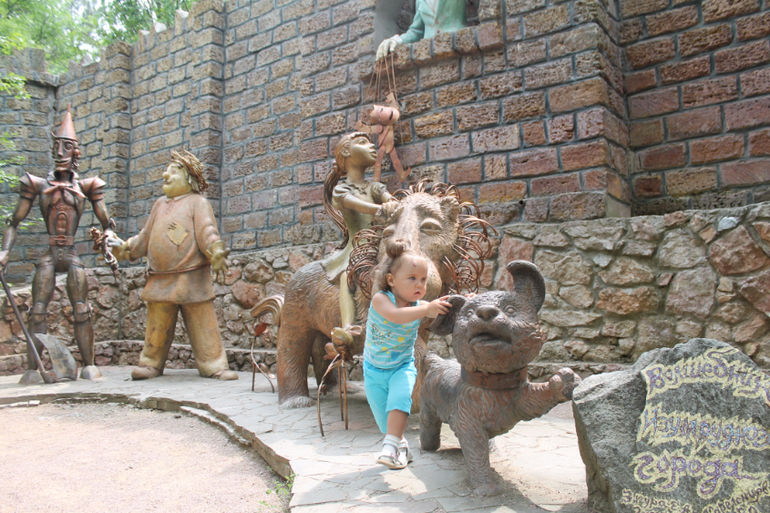 Нагулявшись в зоопарке,мы отправились на Поляну сказок.Все фигурки сделаны из дерева,камня и металла.Деткам очень нравится.Такая поляна для фотографий,бегают и с каждой скульптуркой фотографируются.