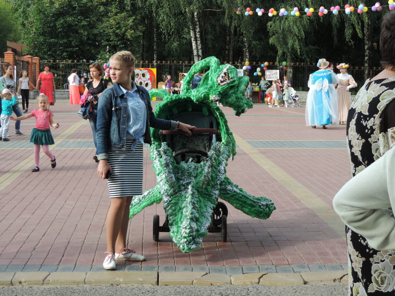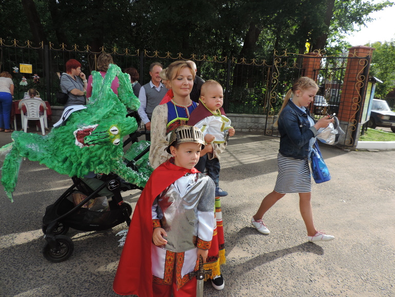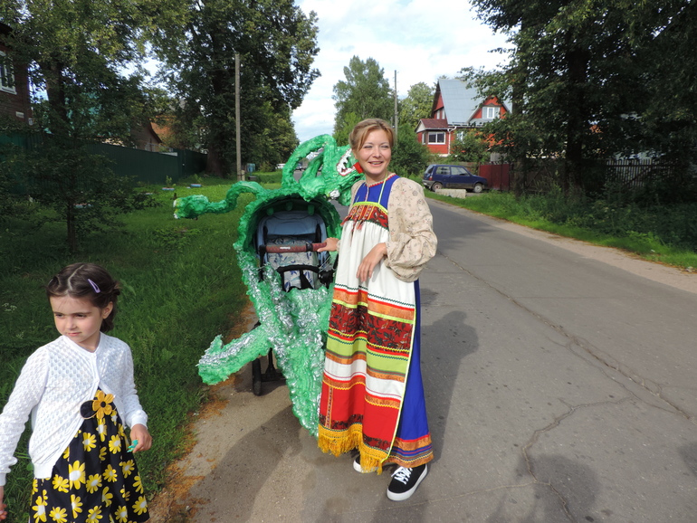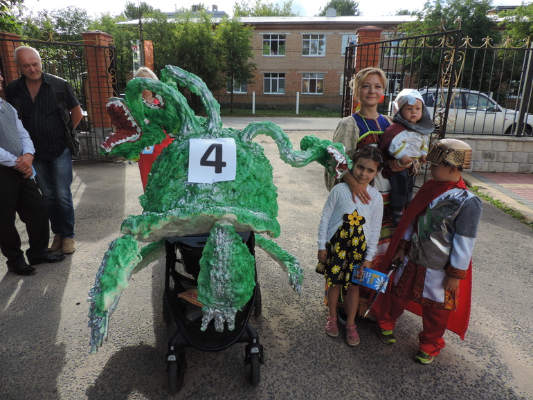 Как только узнали о местном параде колясок, так сразу же решили, что будем участвовать в этом фееричном шоу :-), ну а заодно и поддержать идею проведения этого парада (а то, то ли информации мало, то ли местные жители не очень активные. Маловато участников было). Хоть ваятель из меня так себе, но решили вопротить в жизнь легенду о том, как князь Петр победил змея. Ну а поскольку средний у нас Георгий, то решено было и его принарядить в Георгия Победоносца :-) Маме оставалось всего то, смастерить змея на коляску, да сварганить русскую народную рубахуи плащ для младшего :-) В общем, хоть и растут у мамы-Риты руки не из того места, какой-никакой Змей-Горыныч получился, слегка узнаваем. Все было готово к сроку, а тут в последнюю ночь у нашего Петра бабахнула тем-ра, всю ночь и полдня все тряслись и переживали, что придется пропустить парад. Но все в этот день обошлось, тем-ра спала и активный радостный годовас поехал отмечать свой первый ДР парадом :-)