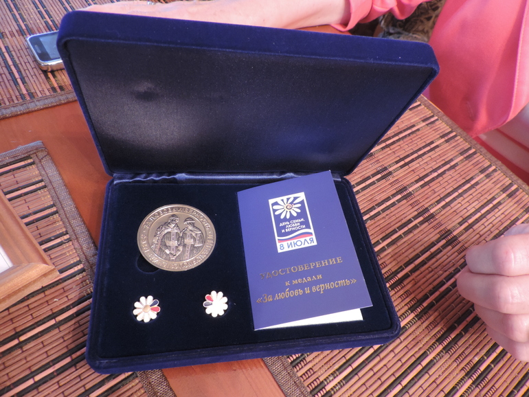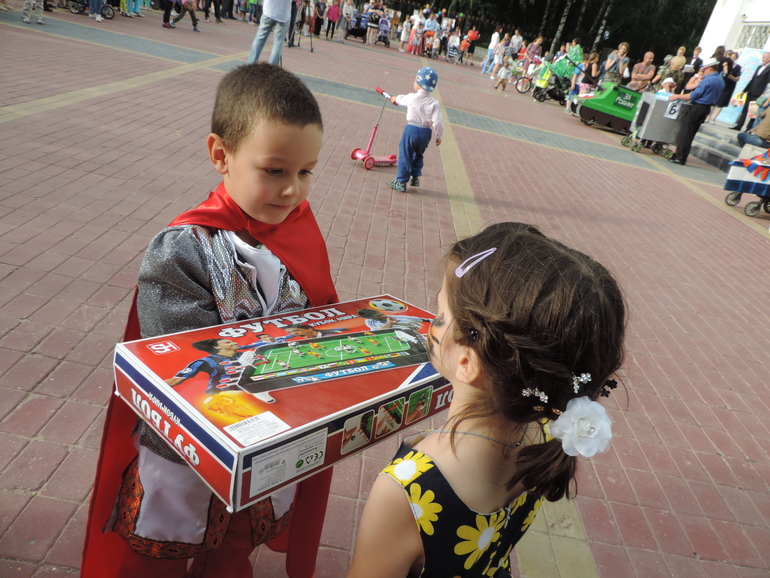 Ну вот, собственно, и все. Конечно, фотки не передадут того радостного настроения, которое царило на празднике. Дети оторвались от души, да еще подарок получили! Место было всего одно - первое. Его жюри присудило коляске в костюме Танка. Ну а мы получили Диплом за участие и награду - настольную игру. Чему несказано рады :-) Ведь главное, не победа, а участие. Заодно и День Рождения нашего Петра отметили, участвуя в этом мероприятии. В следующем году тоже обязательно, что-нибудь придумаем эдакое для нашей коляски :-) Если самой будет лень, то дети заставят, они то навряд ли забудут, как готовили мы нашего Змея к параду. К концу подготовки, практически вся семья поучаствовала в изготовлении Горыныча :-) Дети были в восторге от накладывания монтажной пены и красок на остов Змеюшки.А еще, на празднике, в торжественной обстановке, наши горячо любимые родители получили медаль "За любовь и верность".