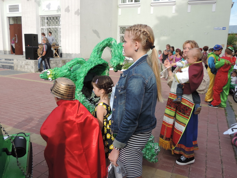 Эт, собственно, мы со змеюшкой нашим отправляемся в путь к радости ничего не понимающих прохожих и проезжающих автомобилей. Теперь то я знаю, что значит выражение "выделяться из толпы" :-) Все внимание было направлено на нас! Еще бы, впереди процессии уверено шагает тетка в народном костюме и катит непонятную инсталяцию, за ней шествуют деть, устрашающе размахивающий мечом, костюме русского богатыря, девочка с мамой (моя сестра и ее дочка), моя мама и папа в светской одежде :-) а у них на руках еще один добрый молодец в русском народном костюме. На подходе к месту парада, даже авария случилась (надеюсь мы тут ни причем). Стали мы дорогу переходить по пешеходному переходу, водитель нас стал пропускать, дак ему в зад въехал другой (видимо загляделся на собирающихся участников парада).