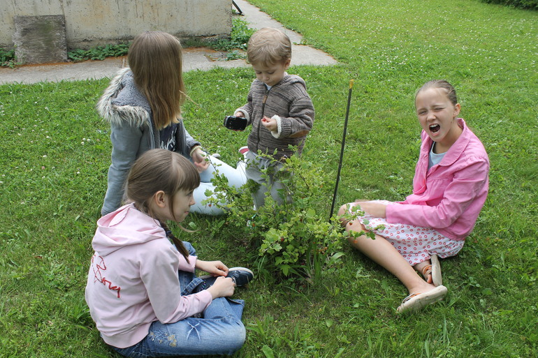 В гостях у моего отца.Дети объедают куст крыжовника.)))Настя,Даша,Ваня и их подружка.