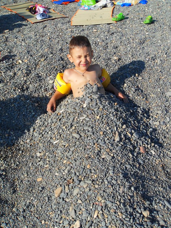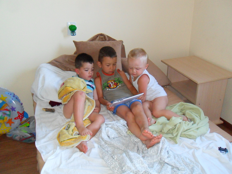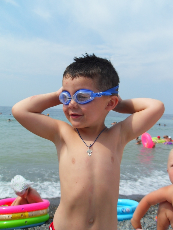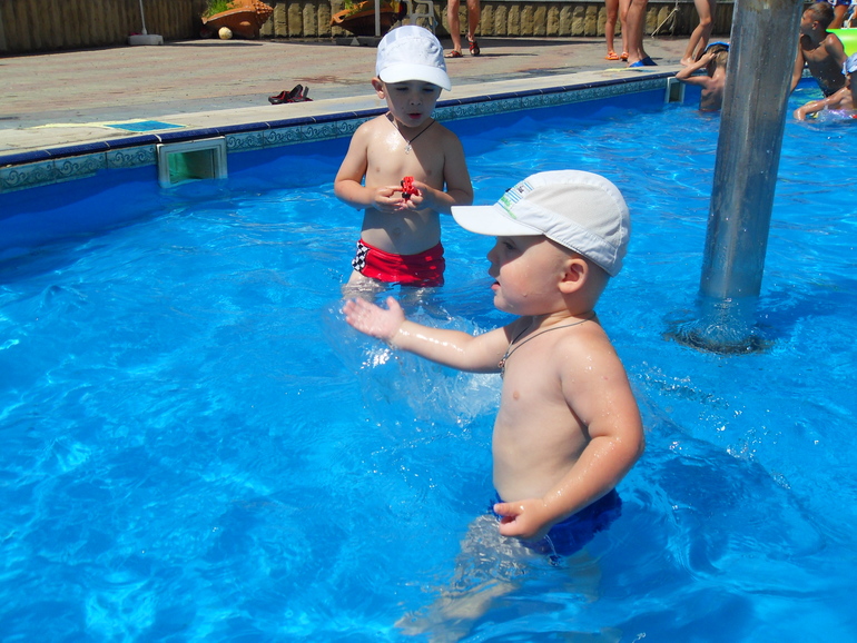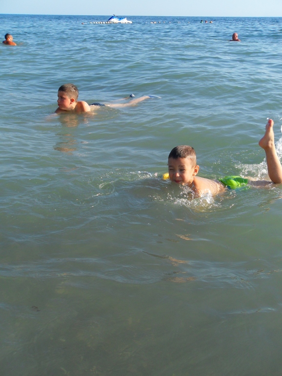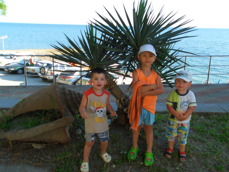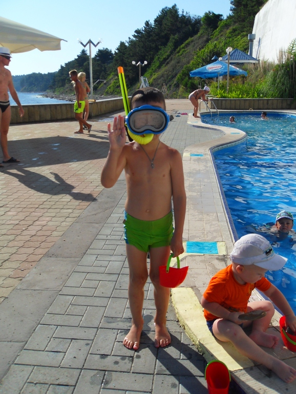 Дениска из моря не вылезал, катался на катере, банане, объелся мороженного. Ванюшка первую неделю боялся заходить в море, купался или в бассейне, или в надувном бассейне (купила там), или просто мочил ножки. Через неделю мы уже с ним уплывали в море. Егорка - в море не купался, боялся, пару раз окунула насильно, несколько раз сам помочил ножки, а так сидел в надувном бассейне с морской водой или купался в обычном бассейне (чего мне не очень хотелось). Дети приехали загоревшие, пускай не сильно, но это уже мелочи, они у меня белокожие (малыши).