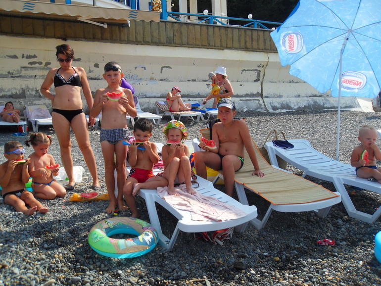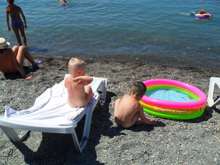 Море: пляж чистый, рядом находится бассейн (к сожалению не с морской водой), там от мелкоты до глубины (разделен на две части), спасатель приглядывает за детьми. На пляже находится бар, где продают кофе, мороженное и алкогольные напитки. Шезлонги бесплатно, но зонтики стоит 100 руб. 4 часа. Пляж каменистый - галька, но все приемлемо. До моря 150 ступенек, но это не много, у меня 2- летний ребенок проходил на порядок больше и проблем не было с ними.