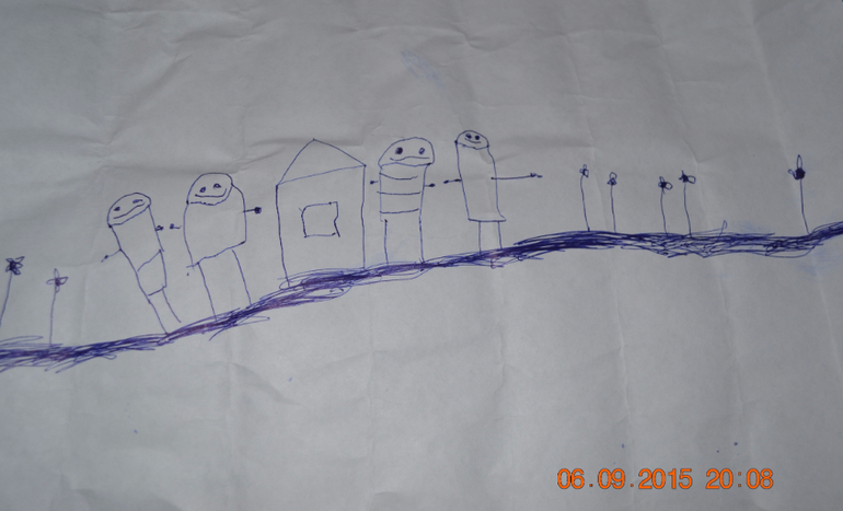 Детки многодетных семейВ садике было задание нарисовать,что больше всего запомнилось летом.Алиса решила нарисовать деревню. На первом рисунке папа,мама,Серёжа и Ксюша.На вопрос где же она?Сказала,что мы получились похожими на гусениц и поэтому ,она у меня в животе.