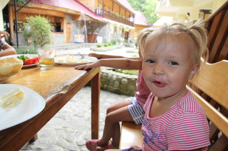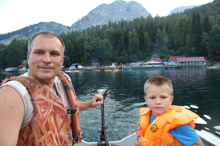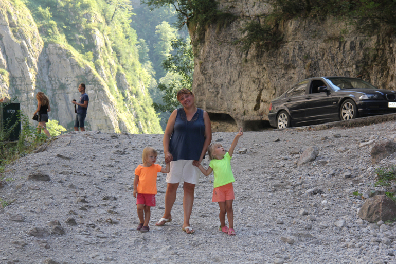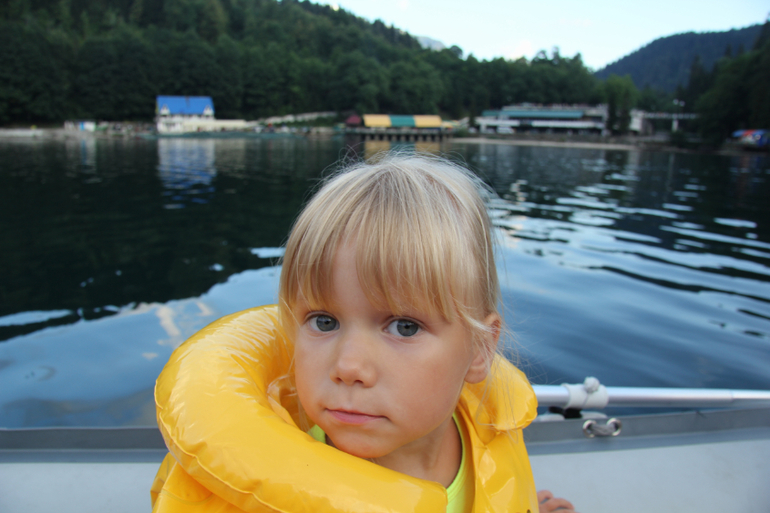3. Абхазия. Как то взгрустнулось мне при прохождении границы стороны России. И это отнюдь не чувство ностальгии по поводу покидания Родины. Это от организации всего процесса. Пассажиры обязаны выйти из машины и проходить границу самостоятельно через маленькое здание. При этом папка наш пересекал машину в комфорте, а я с тремя детьми с такими же мамочками через домик, в котором куча народа и плохо работающие кондиционеры. Моя троица практически передралась в очереди. Миша отказался отвечать дяденьки таможеннику сколько ему лет (ответил, только после того как Маша назвала свой возраст). С горем попал прошли мы и этот этап нашей поездки и въехали мы на территорию Абхазии. Первое кого мы увидели - это коровы. Везде коровы, на обочине, на дороге. Впервые в жизни увидела полосатых коров. Поехали мы на озеро Риц. Природа там конечно обалденная, но здания не ремонтировались наверно со времен СССР. Девочки, если будет возможность, обязательно посетите это озеро! Оно бескрайнее!!!! Мы катались по нему на надувной лодке и так и не поняли где оно заканчивается. Попробовали местную еду - мамалыгу (на любителя), а вот шашлык был очень вкусный. Время на озере пролетело незаметно и мы наивные решили доехать до Пицунды и там остановиться на ночлег. К нашему большому сожалению(сами конечно виноваты) места мы не нашли. Просто поглазели на город. Выбора у нас не было особо, так как ночь на дворе, пришлось возвращаться в Лазаревское. Опять нас ждала граница. У Даши поднялась температура, с нашей стороны границы то ли пересменка, то ли еще что. Местные жители объезжают пробку по обочине. В общем, признаю, что повели себя как редиски (оправдание температура ребенка), мы тоже подъехали ко въезду на границу по обочине. Простояли там 2 часа, наблюдая, как пограничники со стороны Абхазии отводят своих соплеменников в сторонку, о чем то шушукаются, и машина едет куда то в сторону. Опять же на стороне России нас попросили выйти из машины, но так как дети спали, муж мой категорично сказал, что выходить никто не будет. Пограничник с кем то посовещался (видимо с начальством) и нас отправили в дальнюю будку, где и проверили документы и досмотрели машину. Дальше без особых приключений долетели мы до Лазаревского. Так что впечатление о нашей поездки в Абхазию у меня осталось двоякое впечатление: с одной стороны потрясающая природа, а с другой-запустение, ну и конечно граница.
