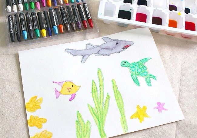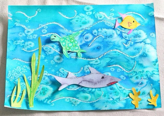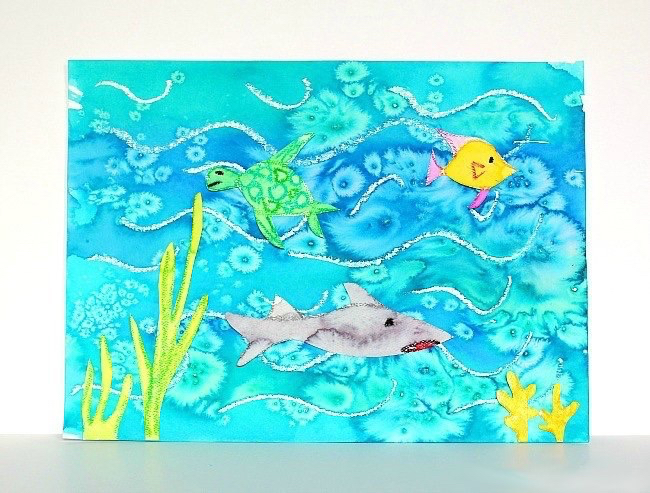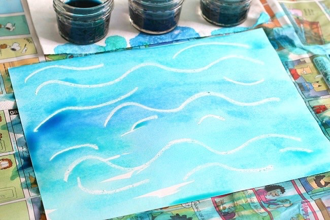 Сначала белым восковым карандашом нарисуйте на бумаге волны. После этого раскрасьте лист акварельными красками синего и голубого цветов. Пока краска не высохла, посыпьте бумагу солью. На бумаге появятся интересные разводы, имитирующие морские волны.