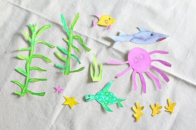 Далее на отдельном листе бумаги нарисуйте цветными восковыми карандашами морских обитателей. Раскрасьте их акварельными красками. Когда краска полностью высохнет, вырежьте их и наклейте на первый лист. Морской пейзаж, выполненный в нетрадиционной технике рисования солью, готов!