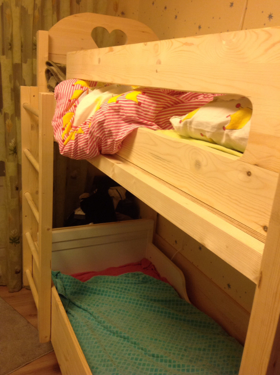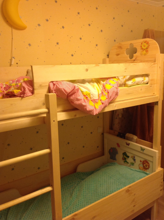 "Украли" мы вашу идею, немного переработали и вот что получилось. Папа у нас тоже к плотницкому делу отношения не имеет ))). Да, и еще у нас была одна кроватка (купленная в икее). Она и стала первым этажом, но при желании ее можно убрать и настелить внизу такую же кровать, как и сверху. Ну и еще мы страшно любим 3Д наклейки, но верх еще весь не успели залепить ))).