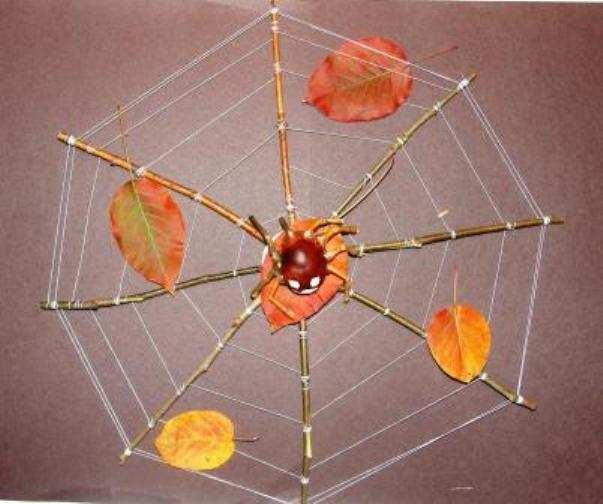 Нужно четыре толстых прутика, белая нитка, каштан, листики, я еще использовала самозатвердевающюю глину для лапок и места для паука (думаю можно заменит пластилином). Скрепляем посередине прутики и начинаем наматывать паутину (нитки), делаем паука из каштана, приделываем лапки, рисуем глаза (я рисовала акрил.краской), сажаем в середину, запихиваем между ниток листочки, все. Чтобы пометить чья работа, прогладила лист дуба наклеила его на картон, вырезала и написала имя ребенка, дыроколом сделала дырочку, продела джут.веревочку и привязала к поделке, получилось замечательно!