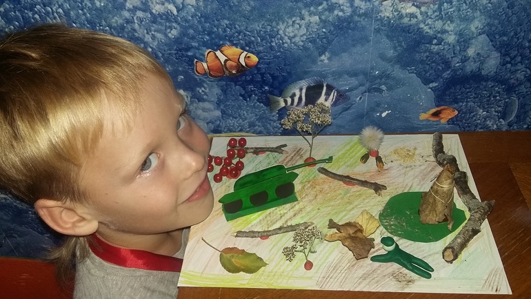 Это наша поделка :-) Её ещё в сентябре сделали, оформили в коробочку, которую сынуля разукрасил и отнесли в садик. А вчера сделали две картины из сухих листьев. На одной деревья. Стволы из пластилина, а кроны из сухих листьев, которые сынок руками размял до крошек и посыпал на клей ПВА. А на второй павлин с хвостом из разных сухих листьев, тело вырезали и приклеили из цветной бумаги. Эх, жалко фотографий не осталось, сегодня отнесли в детский сад, а сфоткать забыла :-(
