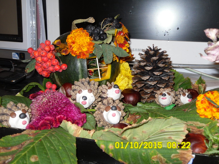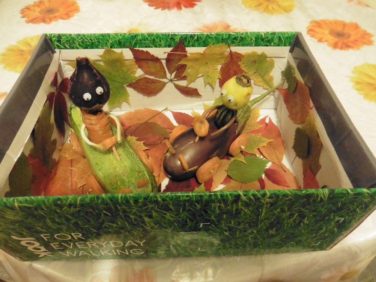 Вот наша. Вчера вечером с сыном поделку сделали и овощное рагу заодно приготовили. Моя помощь минимальна - овощи порезала, глаза,руки человечкам сделала. А так всё сам.