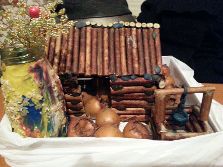 Добрый день, можно узнать из чего сделан третий домик? Первый из соломы,второй из дубовых листиков,третий из желудей,а крыша из чего? Спасибо.