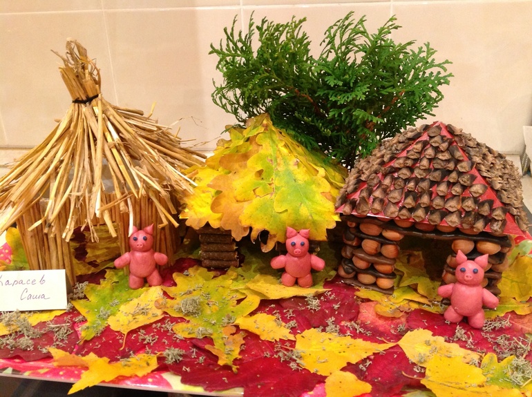 Первый из соломы, второй из деревянных веточек, крыша из листиков, а третий- из орехов, типа кирпичики, крыша- картон с наклееными чешуйками шишек, типа черепица))