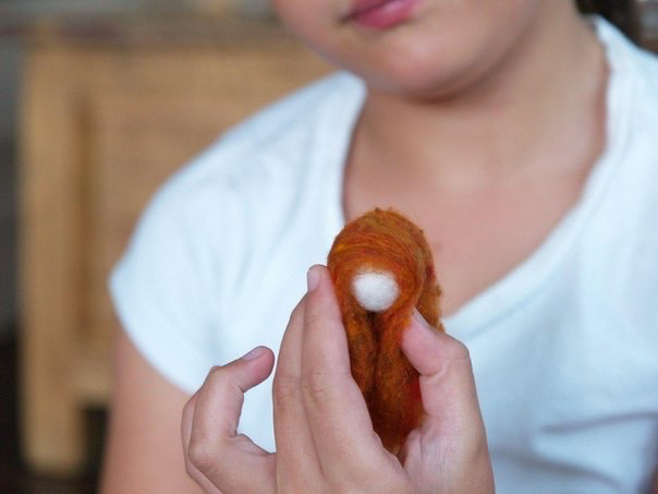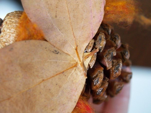 Потребуется: большая сосновая шишка, крупная шапочка от желудя, несколько красивых осенних листьев (предварительно высушите их между страницами книги), фетровый помпон, немного рыжей пряжи, войлока или фетра для валяния, обычный клей, горячий клей и нить, чтобы повесить готовую фигурку. Фетровый шарик можно заменить шариком из других материалов, но лучше из натуральных, например, из дерева. Сверху приклейте «волосы» из рыжего войлока, а на них - желудевую шапочку. Придержите некоторое время конструкцию пальцами в местах склейки, пока клей не высохнет. Приклейте голову феи к основанию шишки горячим клеем, а на спинке зафиксируйте пару красивых рыжих листочков и отрезок нитки. Повесьте осеннюю красавицу в освещенном месте комнаты.