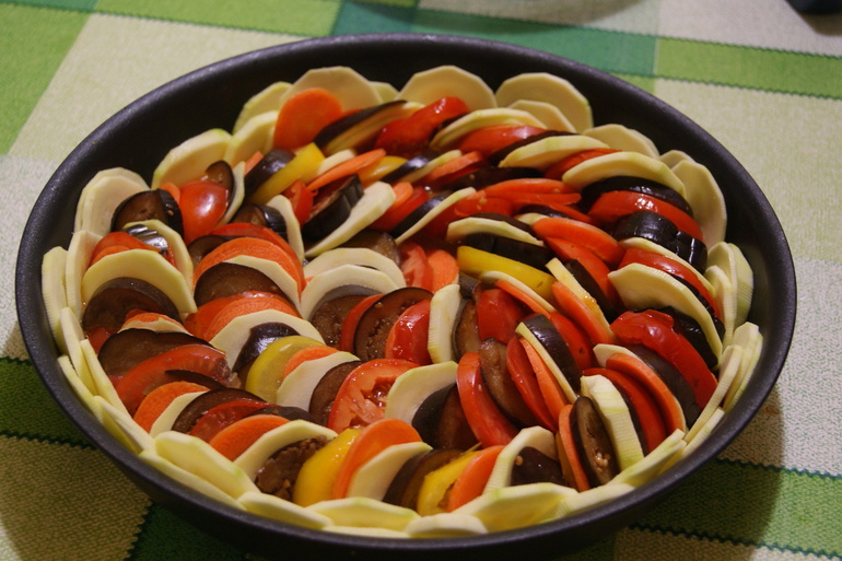 Для того, чтобы рататуй, как из мультика, получился действительно красивым, желательно подобрать овощи одного диаметра и не полениться аккуратно их нарезать.