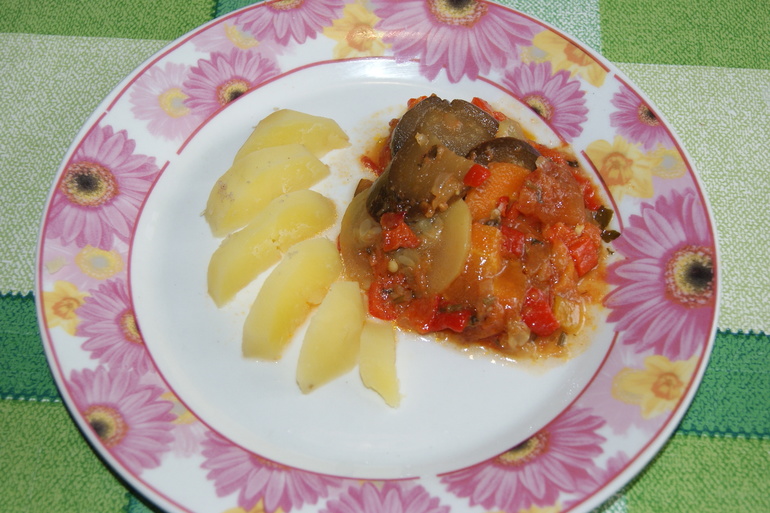 И вот, та-там! Наш рататуй. Так как сын особенно торопился его съесть, не мудрствуя лукаво, подцепила лопаткой,потом как-то додумалась часть положить обыкновенной ложкой столовой и получилось слоями.Но это не самое главное- рататуй получился!!!!