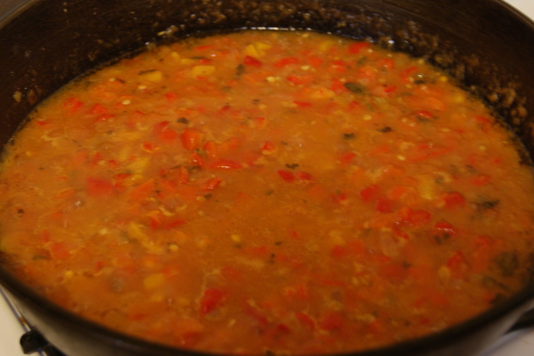 Добавить помидорную мякоть с соком, лавровый лист и целые веточки зелени. Убавить огонь и тушить 8-10 минут. Следить, чтобы жидкости в сковороде было достаточно, если нужно, прикрыть крышкой. Добавить сладкий перец, посолить и тушить еще несколько минут. Удалить тимьян, петрушку и лавровый лист. Дать соусу пеперад немного остыть.