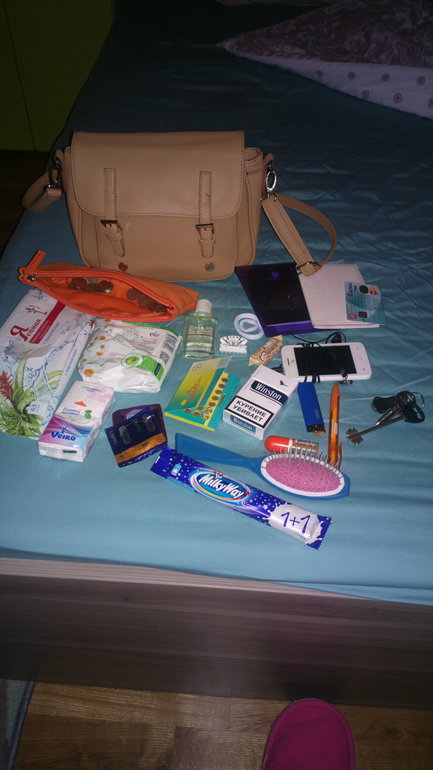 А меня нет сумки. Хожу с телефоном и ключами от квартиры, а бывает и без них. Ну и пару купюр, вдруг шоколадку захочу...