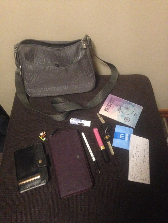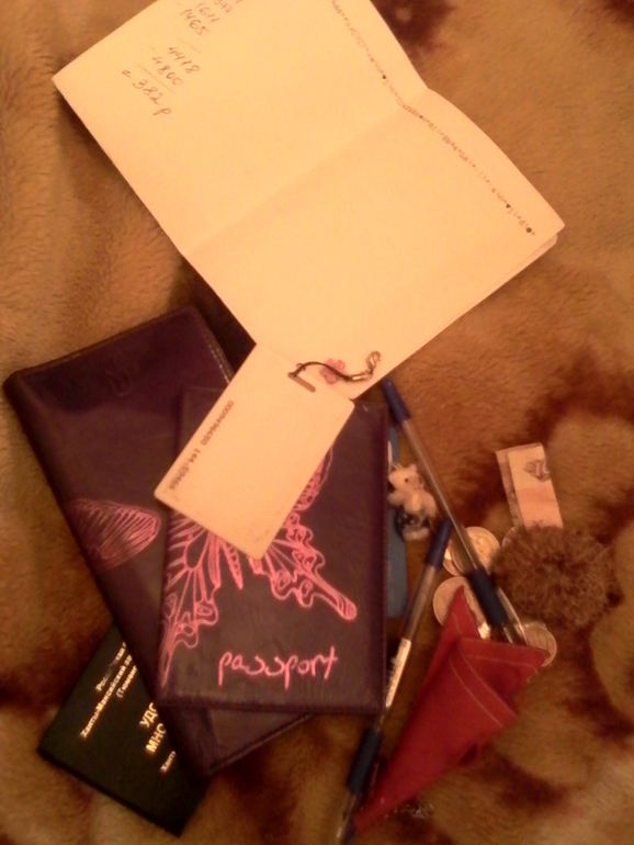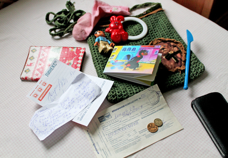 Обнять и плакать: 1 носочек, фигурка лего, погремушка, стека, стишок из садика, рецепт, почтовое извещение ( вторичное) , монетка достоинством в 50 коп и почему-то гривна. Где Украина и где я? Телефон, паспорт, удостоверение многодетной матери.