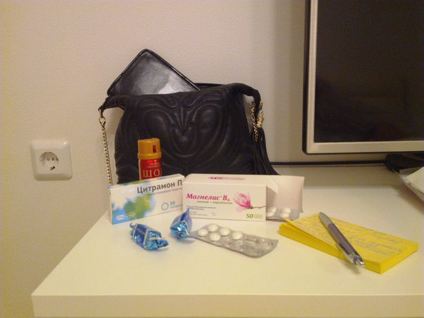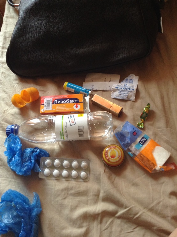 ну, и я попозорюсь ;))) 1. лизобакт и мукалтин - сразу ясно, у кого что болит; аскорбинку дети лопают ;) 2. магнелис в6 - ну, 30-я неделька все-таки идет, надо еще и но-шпочки кинуть; 3. помада (даже не знаю, как затесалась) и бальзам для губ (мальчики вместо гигиенической помады его у меня юзают зимой, потому что он бесцветный и вкусный, хотя я прячу); 4. водичка - Ваньке в Ашане пить захотелось резко, а фантики от конфеток - это мы в лор-клинике лопали; 5. яйцо от киндера - ну, тут понятно ;)); 6. платочки носовые, о которых я всегда забываю и начинаю искать по округе, куда бы сморкнуть детей или себя, короче, бесполезная вещь; 7. бахилы уперла где-то для сада; 8. бумажка для почты с адресами. у меня даже денег нет ;(((((
