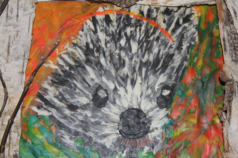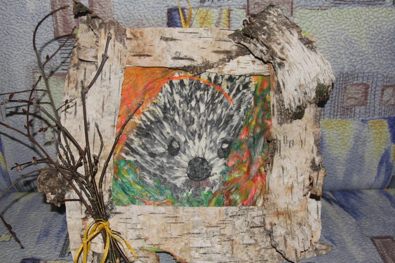 Для Ксюши - пластилиновый ежик, она сама его лепила на бумаге. Нашли мы картинку в инете. Точную копию она не захотела делать, переделала, как самой захотелось. А потом начались терзания по поводу рамки, потому что без рамки всех трудов и не видно вовсе, а ребенок очень старался. Если с Наташей больше 50% я сделала, то Ксюня сама больше половины труда во все это вложила. Особенно ее порадовало отрывание бересты с дров;) у соседей:)))))