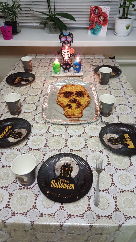 Здорово у вас получилось! Мы не отмечаем, но в этом году дочка увидела по телевизору про этот праздник и всю нед были разговоры только про это, мы купили не много декора в фикс прайсе и тыкву, папа урезал рожицу на тыкве) вот и в принципе всё) тыквы дочери было достаточно, а нам как тот не отмечалось в связи с событиями...