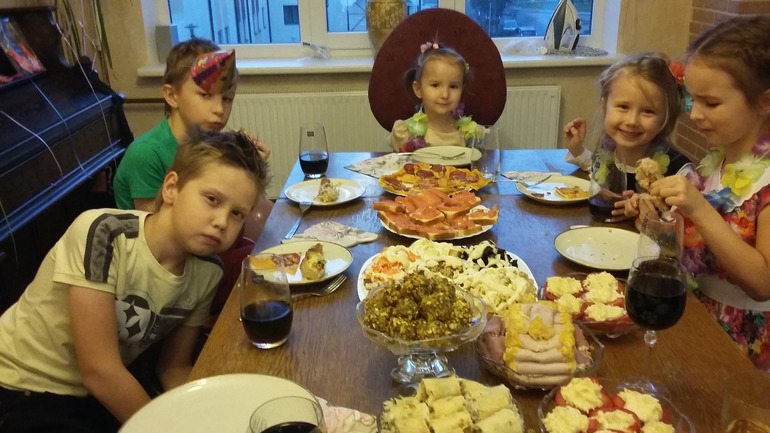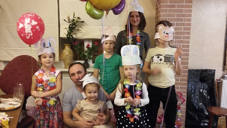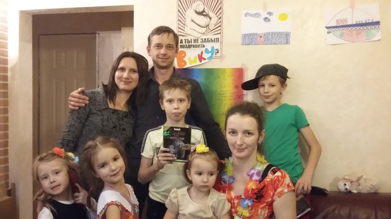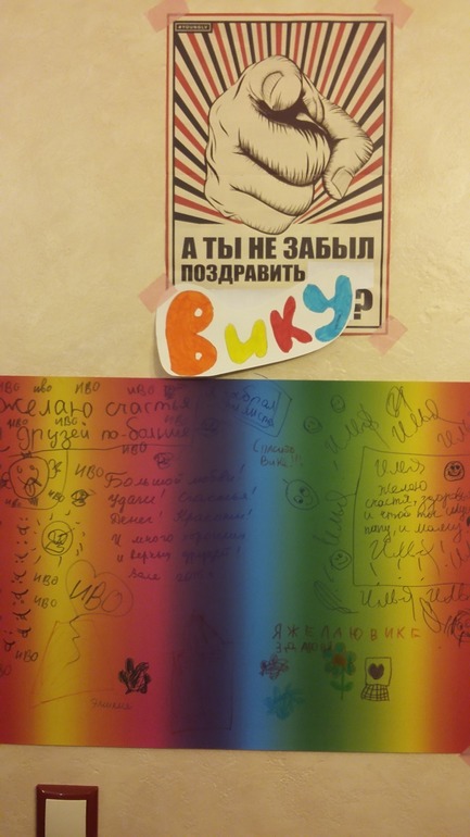 Детки многодетных семейНу вот и мы отметили нашей ягодке 3 годика......Праздник получился весёлый...... Сначала я , такая вредная, заставила всех гостей и домочадцев пройти по тропинке творчества, каждый спел песенку, рассказал стишок и даже станцевал, за что были вознаграждены тропическим ожерельем, колпаком на голову и свистулькой........Викуля приняла подарки и поздравления и все устроили ей салют из воздушных шариков.....а на этом плакате все оставили свои поздравления.....