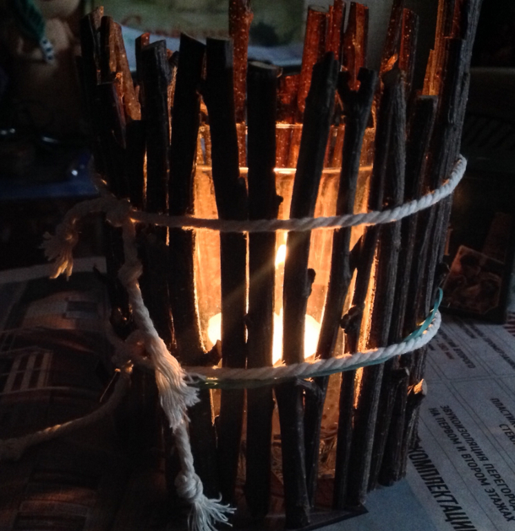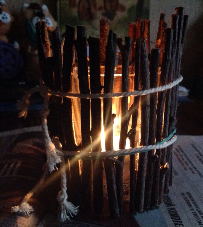 Веточки, хворост, верёвочки , свечка , стакан
