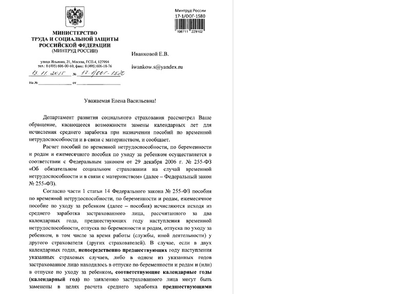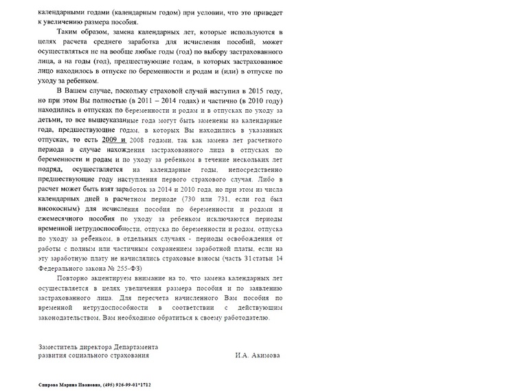 Юридические вопросыЗдравствуйте! Очень расчитываю на вашу помощь, может уже кто сталкивался. Проработав два года 2009-2010, я ушла в отпуск по БиР с 29.10.10г, пособие расчитывалось из расчета 12 мес до страхового случая. Не выходя на работу с 28.12.12 г я пошла в отпуск по БиР со вторым ребенком, пособие по БиР считали по моему заявлению из расчета 12 мес, а пособие до 1,5 лет из расчета среднего за 2009-2010 гг. С 6.11.15 г я не выходя на работу ушла в отпуск по БиР с третьим ребенком. Предоставила на работу необходимые заявления, в том числе и о том, что расчет производить из расчета среднего за 2009-2010 гг. Но получила отказ от бухгалтера со словами, что считать мне будут исходя из МРОТ. Сослалась на ФСС. ФСС в свою очередь ссылается на Письмо Министерства труда и социальной защиты РФ N 17-1 / ООГ -1105 от 03.08.15 г., но там во-первых, рассматривается конкретный случай, а во-вторых, есть ФЗ N 255 " Об обязательном социальном страховании на случай временной нетрудоспособности и в связи с материнством " ! Кто прав?