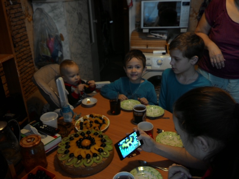 Дома вынимаю коржи,промазываю йогуртом,убираю обратно в холодильник.По пути давая Максу пинка,чтоб убрал свои вещи)))16.00Кормлю мелочь полдником.Пюрешка,творог,кефир