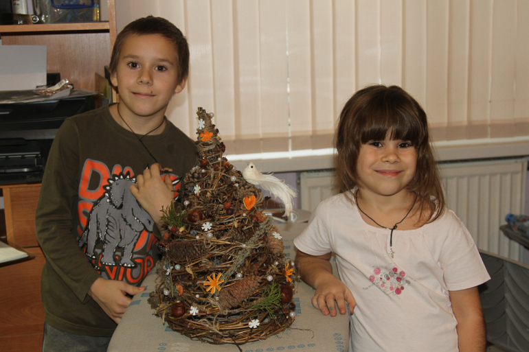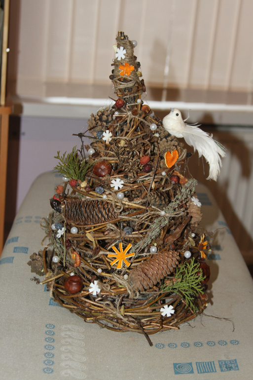Саня, третий класс. Виноградная лоза, ветки черешни (ну, что под рукой росло), шишки из-под выпадающего прямо на глазах снега - вовремя снежок как раз пошел:))) Плюс всякий пахучий материал - специи, короче:) Перец, гвоздика, корица, кофе, разные орехи, разные сухофрукты (сами сушили, кстати), бусины, клеевой пистолет, шпагат. Может, что и забыла:) Да, забыла - ароматические вещества : ванилин, молотая корица, масло пихты, масло лимона и жасмина. Вечер - на ощупь клеили:)