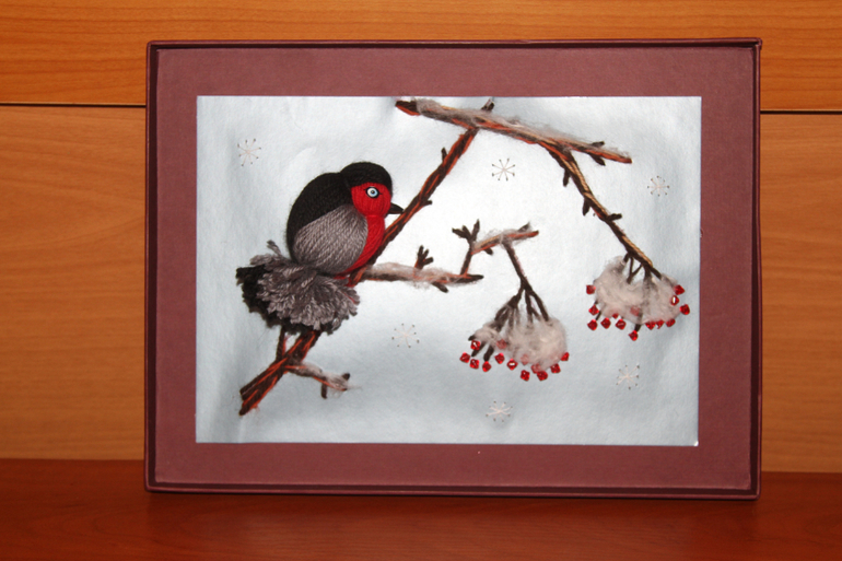 Получилось хорошо, повышивали вместе по картону, поглядели, как узелки делаются. Птичку тоже вместе мастерили. Снегирь уже в школу в пятницу ушел и всем понравился:)