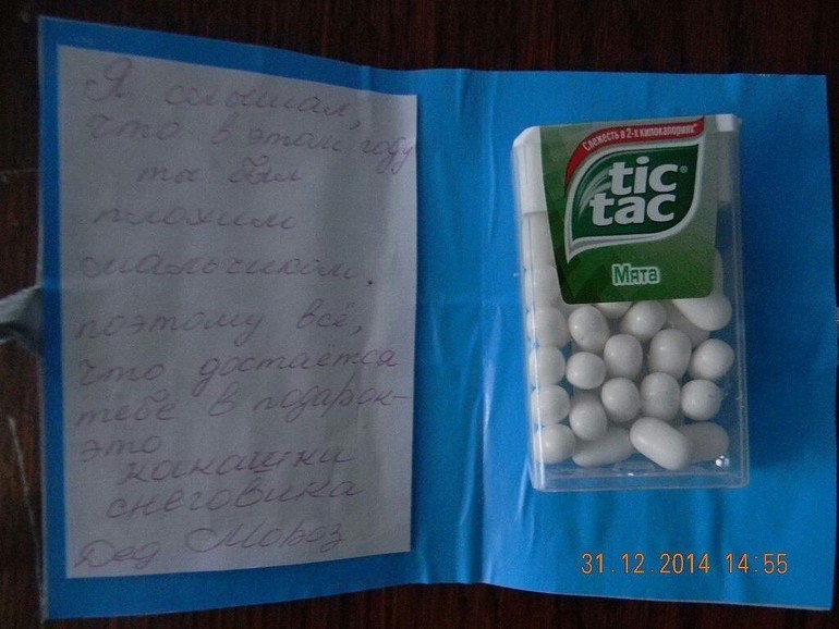 Такой стеб- это конечно для тех, кто постарше. Ближе к 20годам. Для тех, кто в деда мороза не верит. А потом можно после такой открытки дать все равно подарок, пусть и не тот, который ребенок хотел сильнее (дорогой к примеру), но все равно нужный и желаемый, просто попроще, подешевле, итп. Для маленьких это неприемлемо. Наказывать можно и по другому. А вообще, я считаю, что баловать детей дорогими подарками не стоит. Надо баловать их своим вниманием. Если у меня простой телефон, в честь чего я буду покупать детям какой то айфон? Чтоб ходили пальцы гнули в школе? Такие подарки я считаю бессмысленными. На них нужно самим зарабатывать. Вот такое имхо